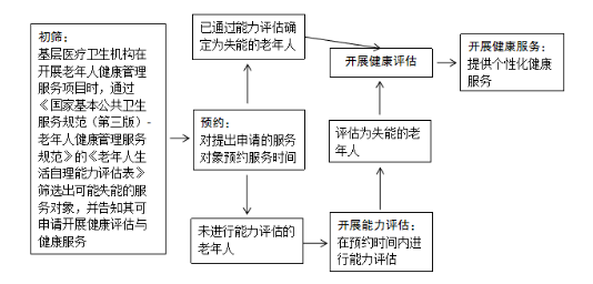 1.初筛:基层医疗卫生机构在开展老年人健康管理服务项目时,通过《国家基本公共卫生服务规范(第三版)-老年人健康管理服务规范》的《老年人生活自理能力评估表》筛选出可能失能的服务对象,并告知其可申请开展健康评估与健康服务。